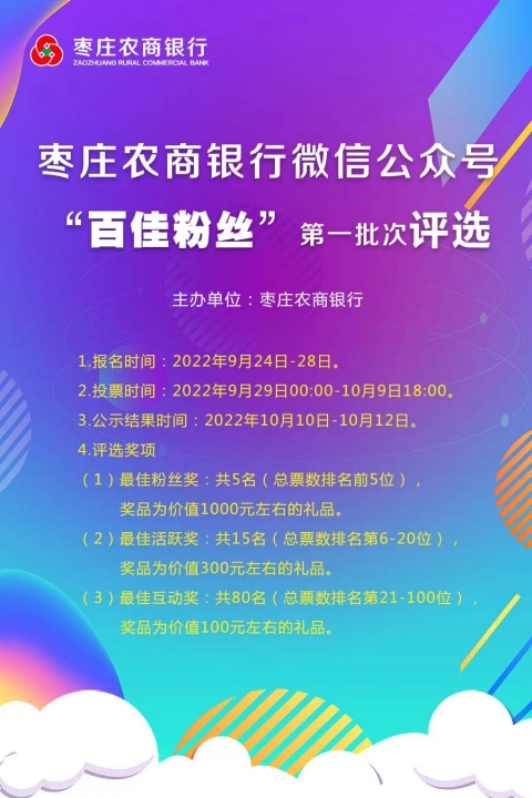 棗莊農(nóng)商銀行微信公眾號(hào)“百佳粉絲”評(píng)選活動(dòng)開始報(bào)名啦!