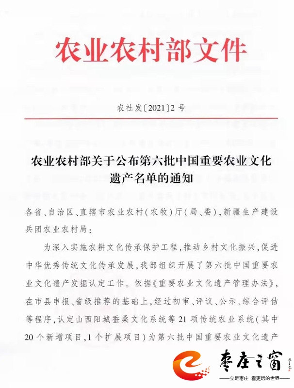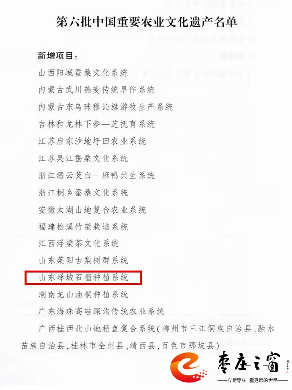 11月16日,農(nóng)業(yè)農(nóng)村部公布第六批中國重要農(nóng)業(yè)文化遺產(chǎn)名單,認(rèn)定山西陽城蠶桑文化系統(tǒng)等21項傳統(tǒng)農(nóng)業(yè)系統(tǒng)為第六批中國重要農(nóng)業(yè)文化遺產(chǎn),其中嶧城石榴種植系統(tǒng)入選。